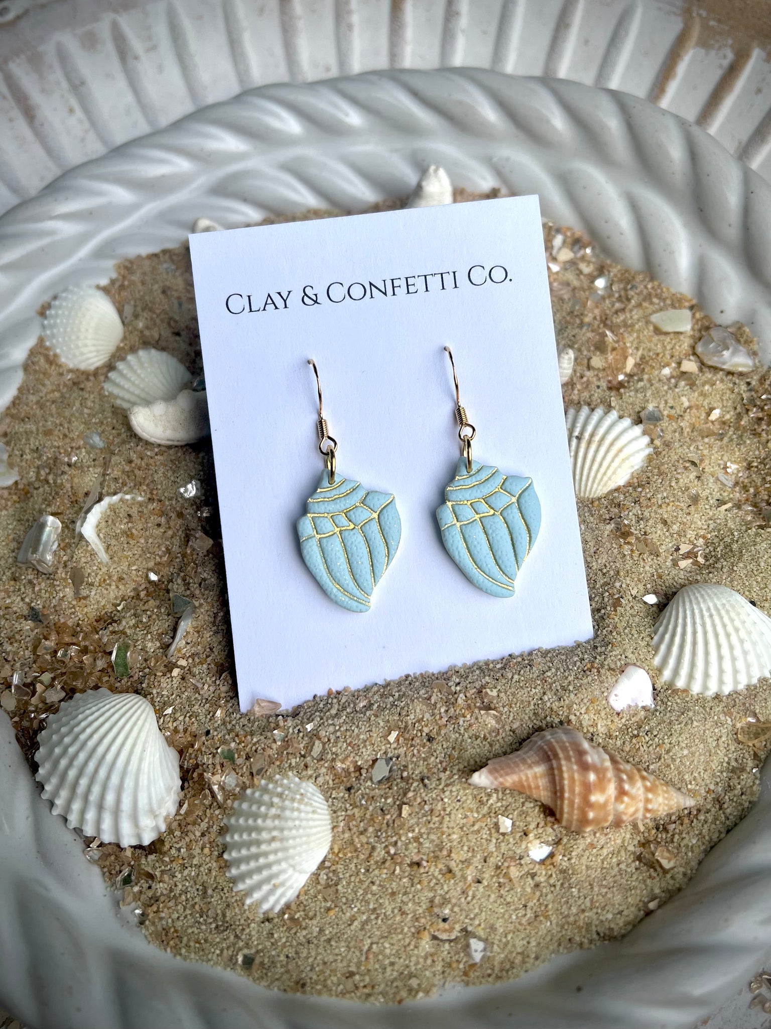 aqua with gold imprint conche shell dangle